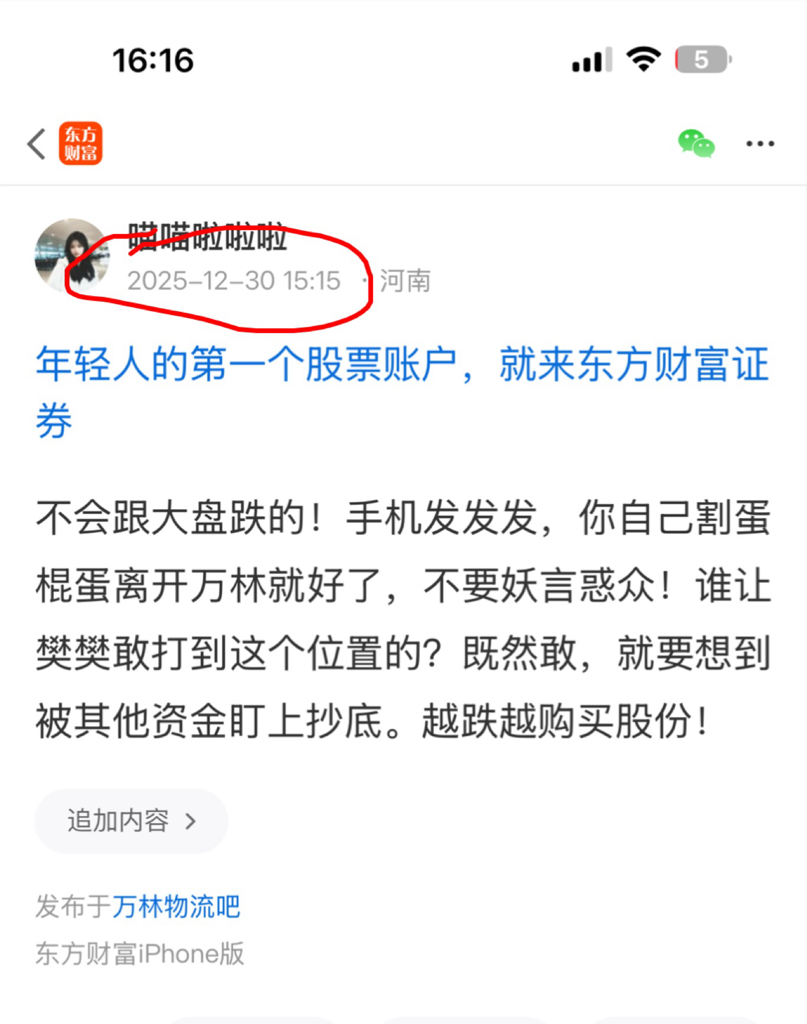 仔细看我12月30日的帖子,这个股吧有很多脏东西,他们低位唱空不是什么好人。我在低位大伙说买点,估计惹来了主力腿子。吵架没有任何意义,既然惹我了,今后对万林实盘进行分析解读。