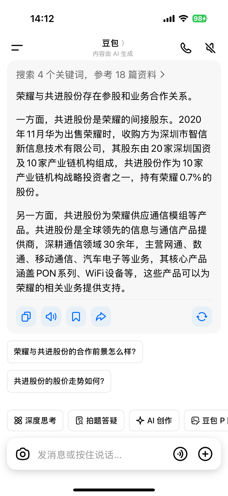 看到别人发的截图说荣耀和共进就去豆包搜索了一下,给出的是这个答案