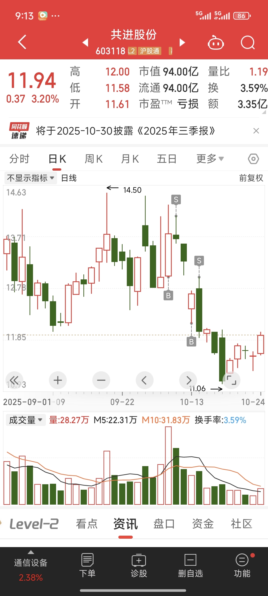 $共进股份(SH603118)$ 对于这个消息有多大的预期如何呢?我来说说我的看法。其实从我第一天买入就知道他有东西,但洗盘的过程煎熬,后面的一次上车也没有踏上节奏。逆势发生在国庆前两天,两天两次炸板,最后一次上板爆巨量,主力对倒明显,15万手一笔上去,主力在板上挂单不少。后续还在持续上拉动作,国庆回来后的几天就弱势洗盘了。甚至说表现拉胯,唯一的亮点是跟着板块砸的,主力不需要太多筹码砸盘。总的来说我认为这样跌会锁住太多筹码,其次是有人会补仓。因此从主力吸筹的动作这个消息是一般的,认为理想的状态是横盘洗好一点,破位可以有,阳线收回来,形成平台突破,毕竟一直炸板骗人,也给散户形成了思维定势。