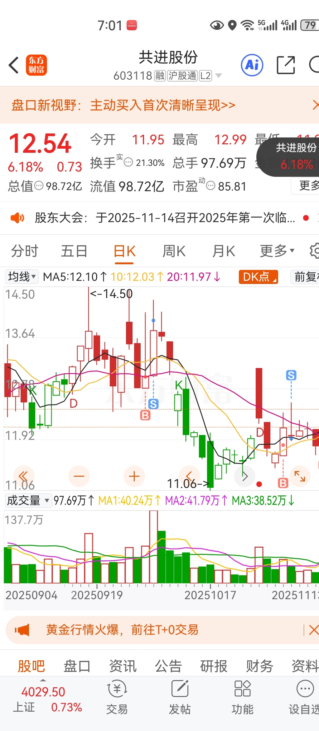 $共进股份(SH603118)$ 14块多卖的,回头看看,还是不能格局,格局必套