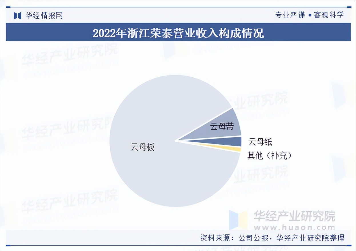 浙江荣泰电工器材股份有限公司的主要产品包括云母硬质材料、柔质材料、发热组件、热管理云母安全组件以及各类云母衍生产品。浙江荣泰先后建立了“省级企业研究院”、“省级高新研发中心”等系列创新平台,通过了ISO9001、ISO14001、ISO14005及IATF16949等体系认证,产品通过了UL、FDA认证,满足欧盟RoHS、REACH环保要求。2022年,浙江荣泰实现总营收6.67亿元;其中,云母板、云母带和云母纸的营收占比分别为88.78%、7.28%、2.69%,