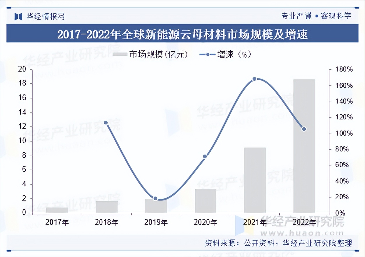2017年至2022年间,全球新能源云母材料的市场规模由0.8亿元增至18.6亿元,期间年复合增长率为88.1%。未来,伴随着云母材料相关提炼及应用技术的逐渐成熟,云母材料在新能源汽车领域中的应用将从动力电池板块向整车耐高温绝缘防护零部件等更多场景拓展,并向新能源商用车渗透。