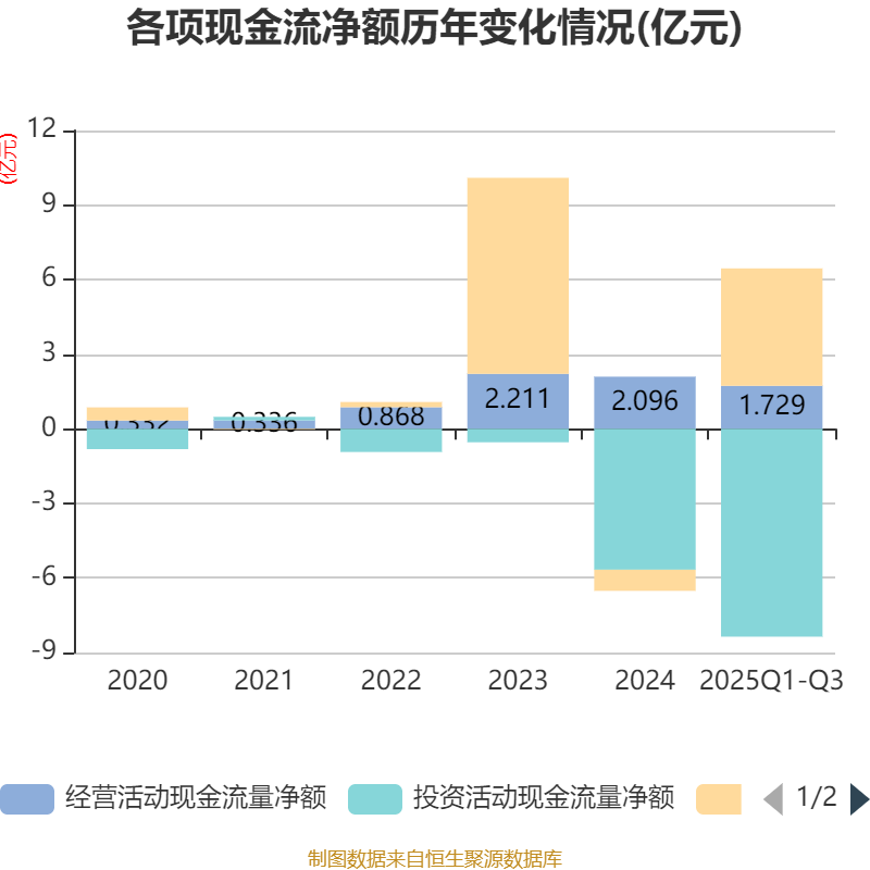 2025年前三季度,公司经营活动现金流净额为1.73亿元,同比增长8.31%;筹资活动现金流净额4.72亿元,同比增加5.55亿元;投资活动现金流净额-8.36亿元,上年同期为-6.72亿元。