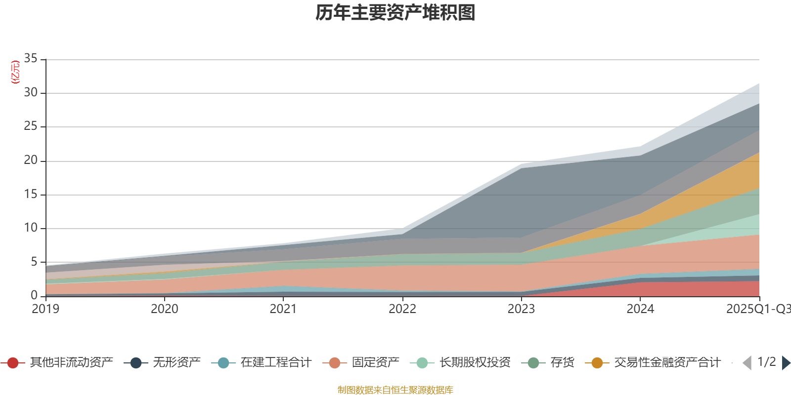 资产重大变化方面,截至2025年三季度末,公司货币资金较上年末减少32.86%,占公司总资产比重下降13.92个百分点;长期股权投资占公司总资产的9.61%,上年末为0;交易性金融资产合计较上年末增加137.36%,占公司总资产比重上升6.67个百分点;商誉占公司总资产的4.74%,上年末为0。