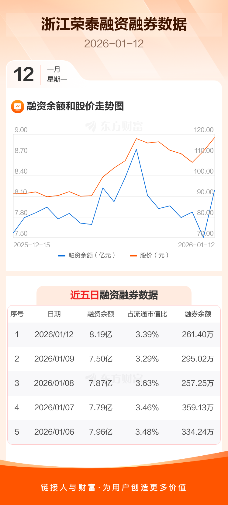 交易所最新数据显示,浙江荣泰于2026年1月12日获融资买入2.74亿元,融资偿还2.05亿元,当日融资净买入6896.91万元。目前,该股融资余额8.19亿,占流通市值比例为3.39%。