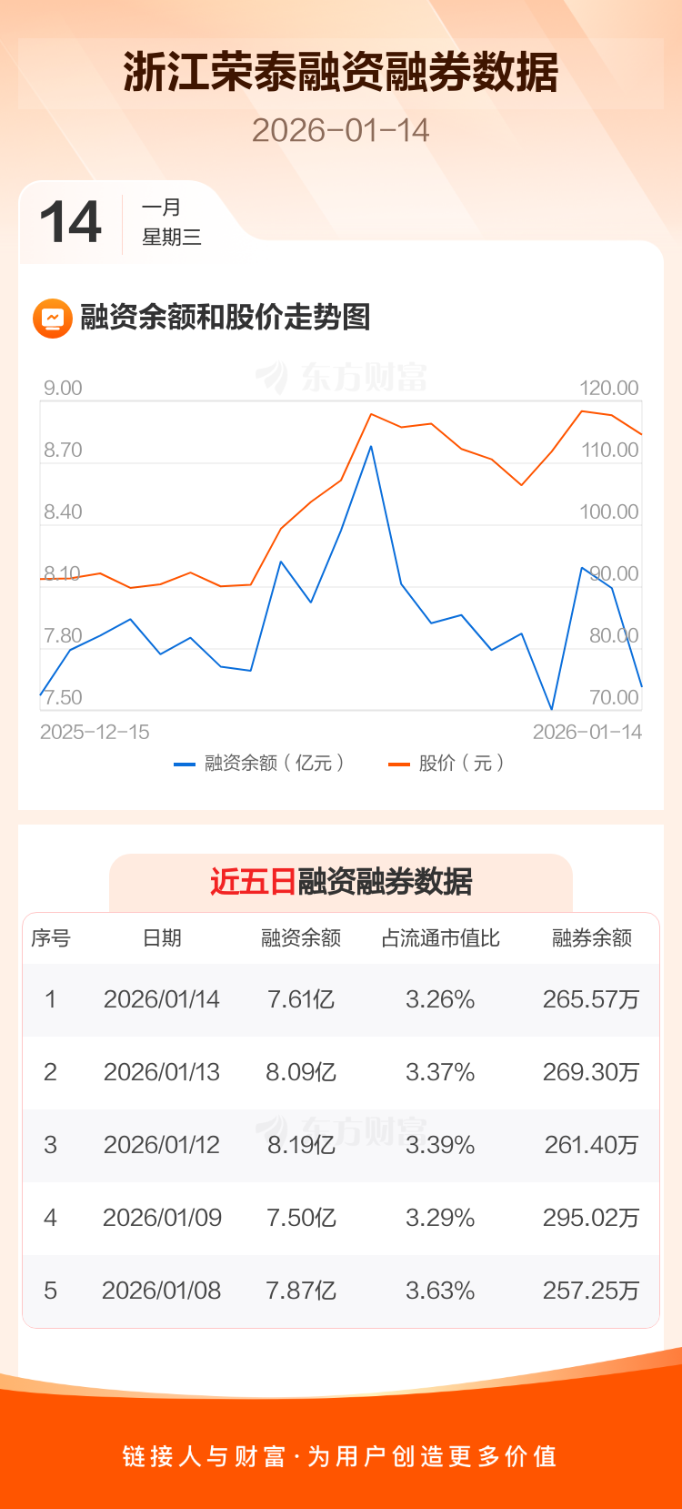 交易所最新数据显示,浙江荣泰于2026年1月14日获融资买入1.39亿元,融资偿还1.87亿元,当日融资净偿还4808.27万元。目前,该股融资余额7.61亿,占流通市值比例为3.26%。