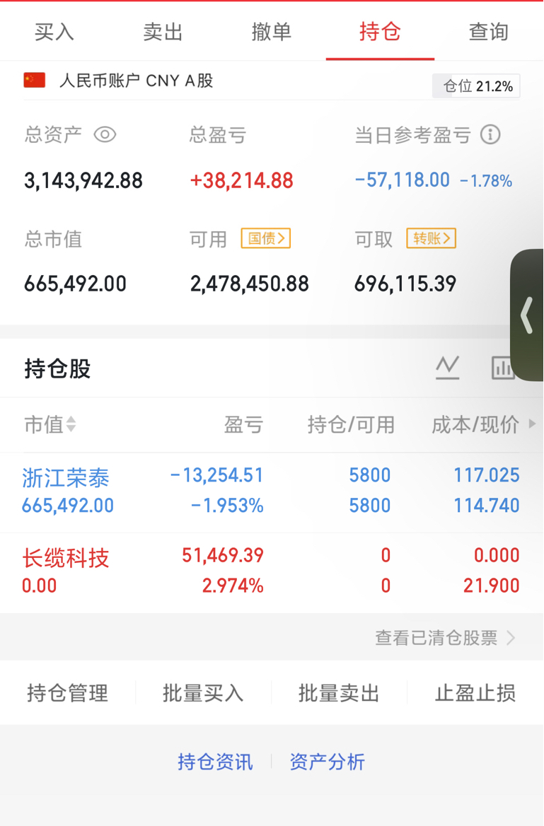 实盘34天持有,浙江荣泰603119卖出,长缆科技002879支持我的朋友点赞打
