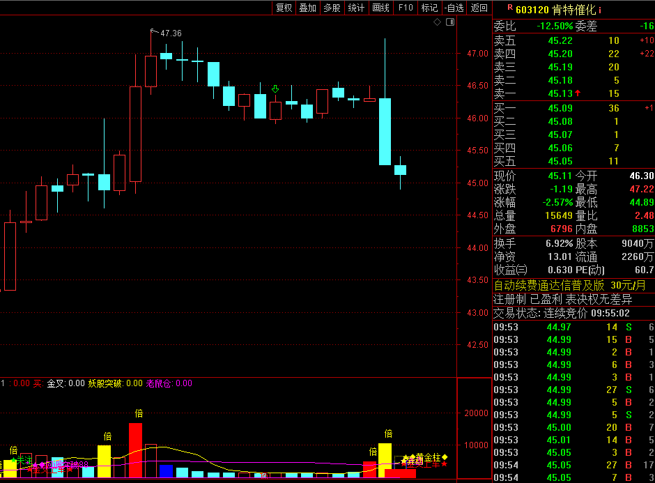 开始套人了,15分钟跳水放量,此时不出何时出呢!该股是次新股,盘子很轻,这几天的