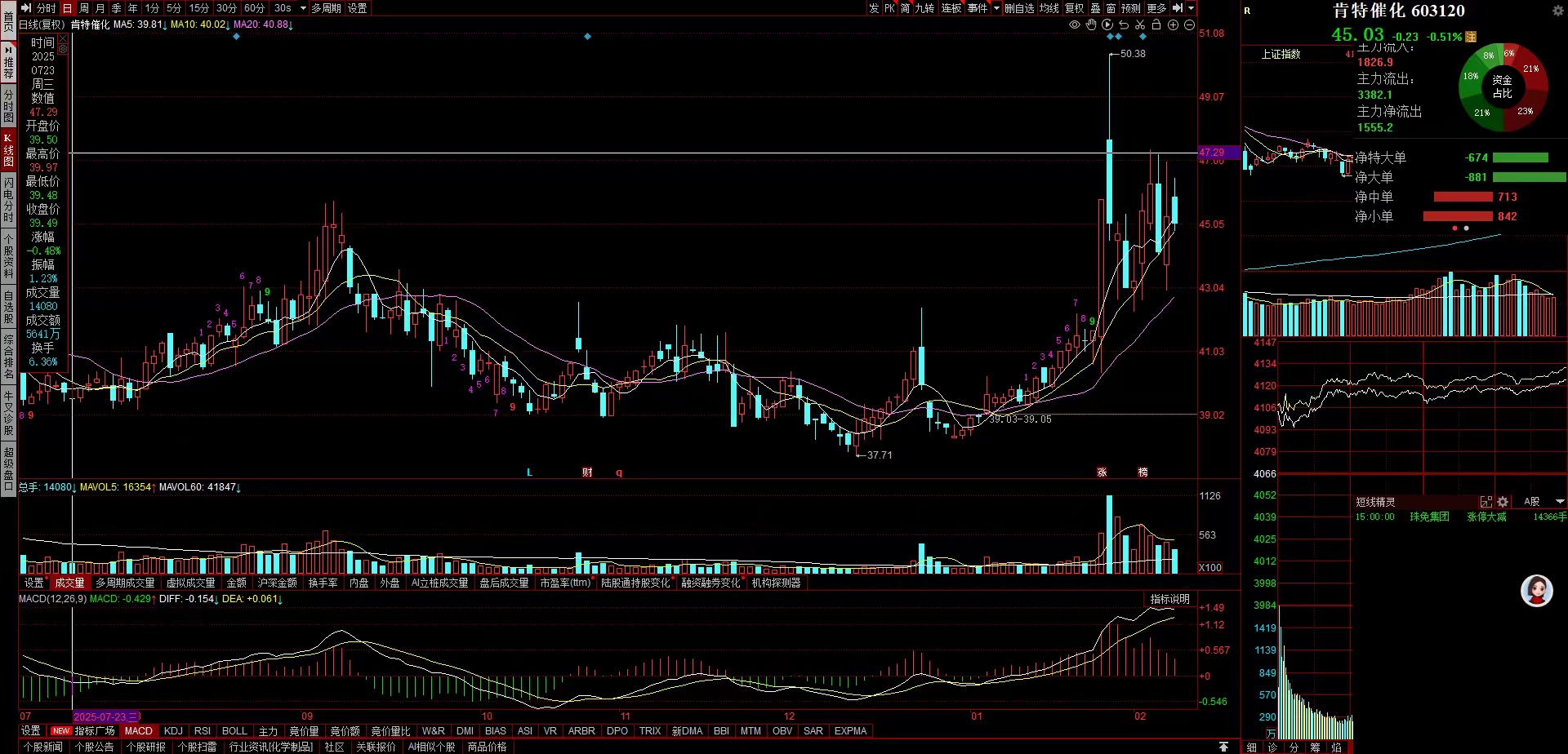 $肯特催化(SH603120)$ 1 月 29 日最高 45.10 元、2 月 4 日 47.36 元、2 月 6 日 46.98 元,三次冲击 47 元以上区间均跳水回落,2 月 9 日股价距前高跌幅达 4.8%