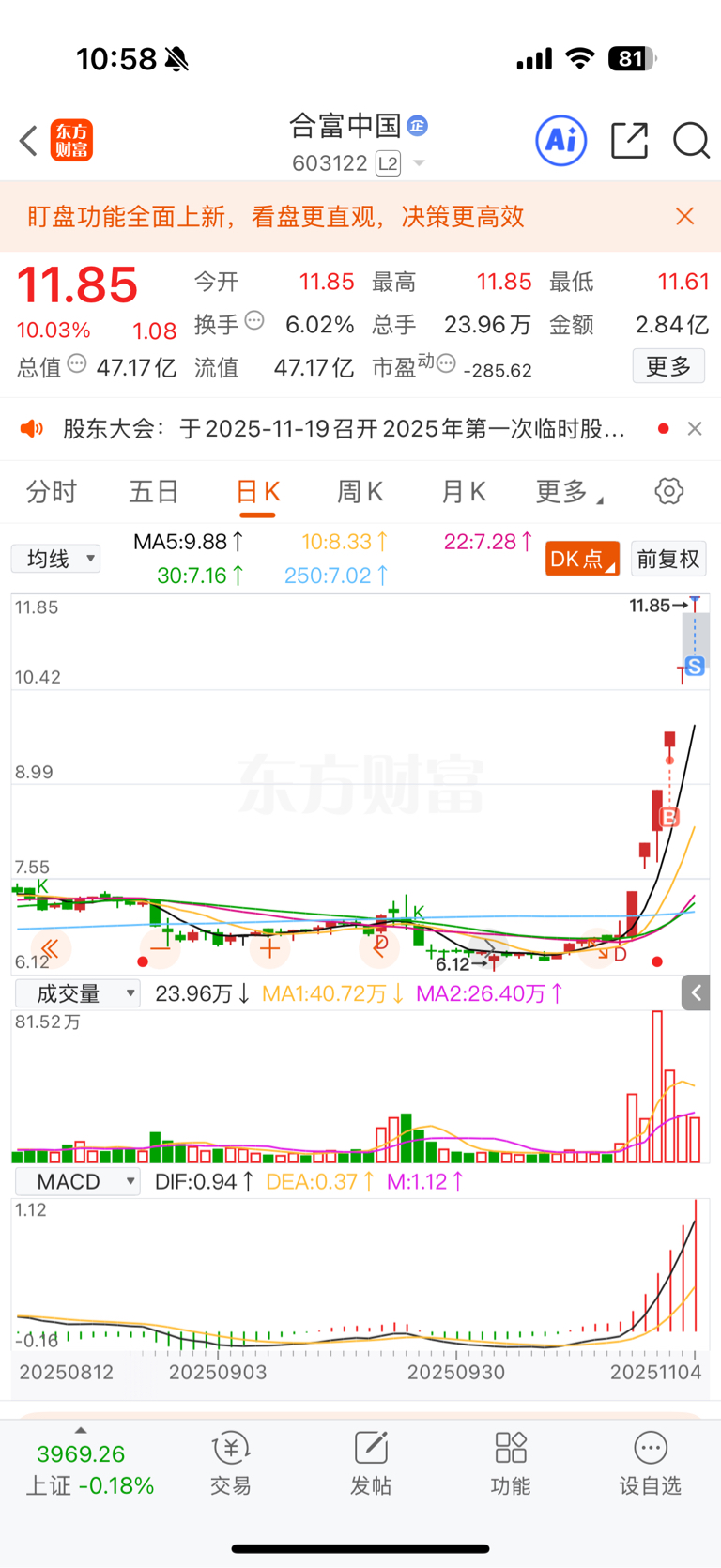 $合富中国(SH603122)$ 集合竞价看封不住,就卖了,想着下杀四五个点再接回,没想承接这么强,有妖股潜力