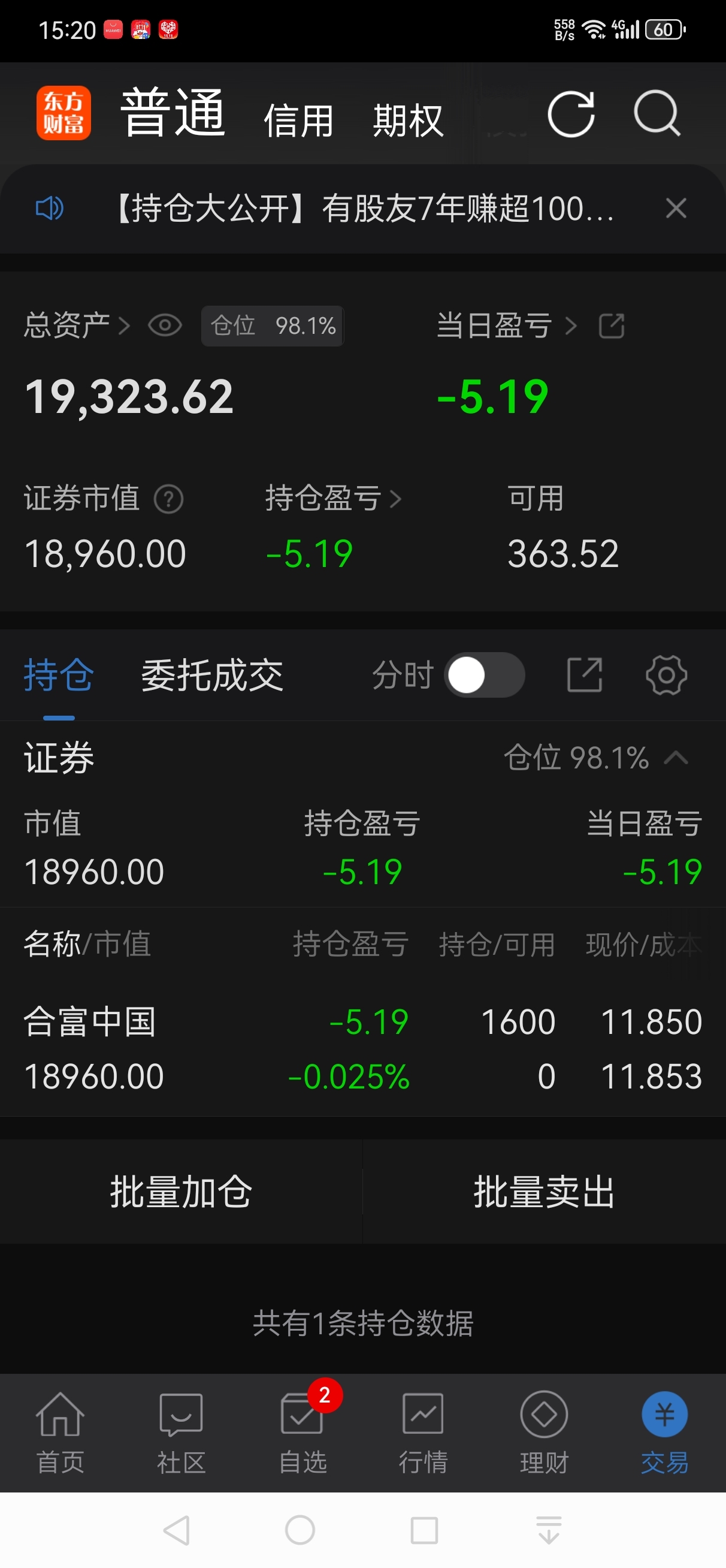 $合富中国(SH603122)$ #实盘记录# 14万资金实盘第32I天,现全没了(借钱9万帮解套),借钱9万元又变1.93万元,14万解套了又亏损完了。借钱9万又亏7.07万元。破2万元了。