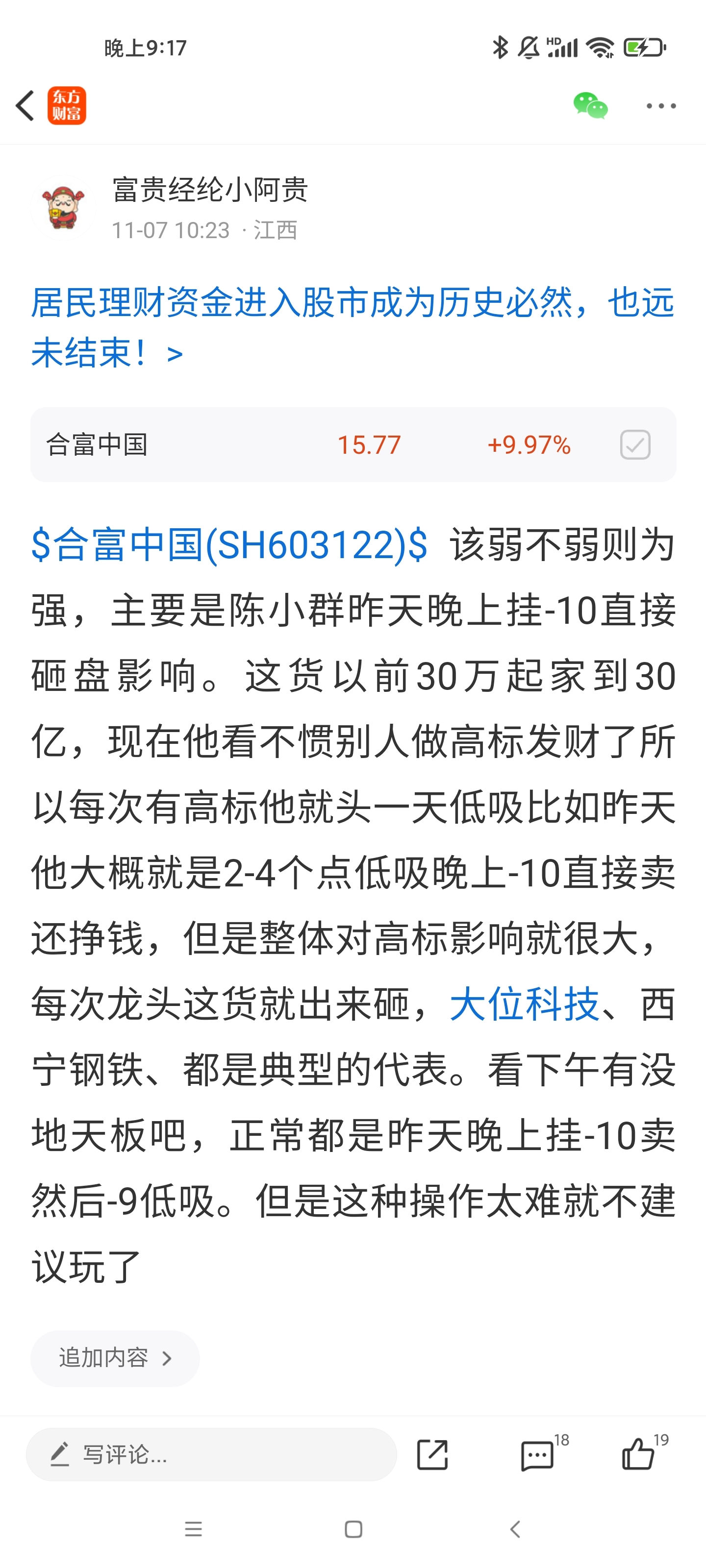 $合富中国(SH603122)$ 有谁上午认真看了我10:23的帖子呢?正常地天板很难逃脱,上午盘面很强也只有我说了吧,各大博主上午都在哀嚎因为他们根本没看懂盘面,早盘承接了陈的砸盘,陈自己也发现砸不动了就索性不卖了留了部分仓位礼拜一再砸(实际我也搞不懂他为什么砸正常今天可以开盘1分钟就封板的),可能成为了有钱人都是防守为王了跟他起家阶段不一样。
