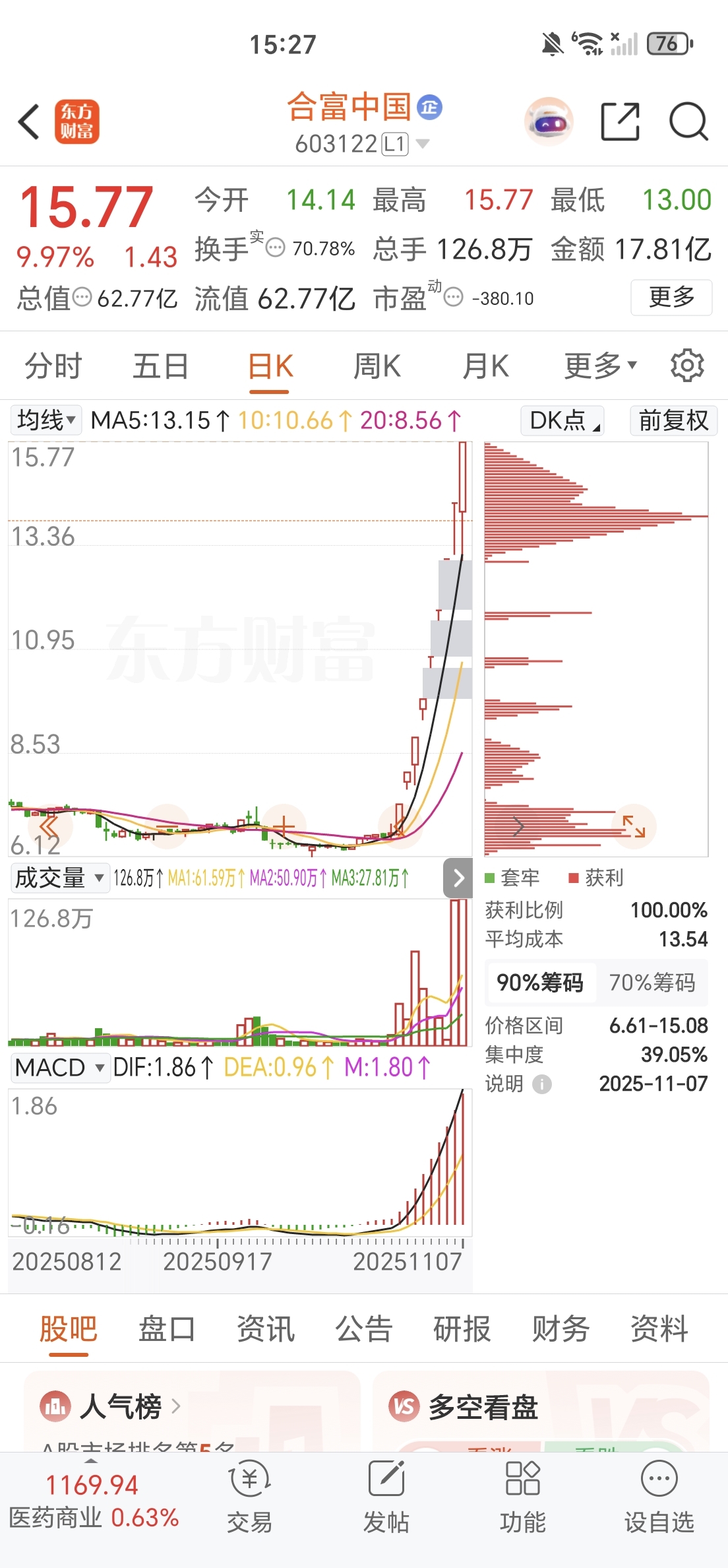 $合富中国(SH603122)$ 看到13板