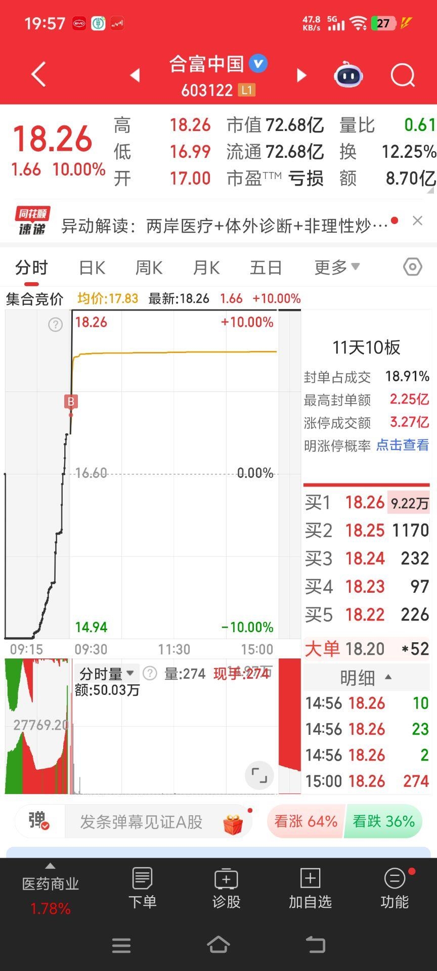 $合富中国(SH603122)$ 今天三笔操作,两个点清仓多氟多,集合竞价挂买合富中国,尾盘介入顺钠股份。简单谈谈早盘竞价就敢买入合富中国的理由,首先是放量集合竞价抢到高开就代表了大资金都态度。其次是最近严重异动后的票反馈并不差。最后就是不敢做龙头的选手永远成不了游资。明天正常来说如果是小幅低开还有冲高预期,再找卖点。如果是大幅低开可能直接就走了。(个人投资思路,切勿模仿。)