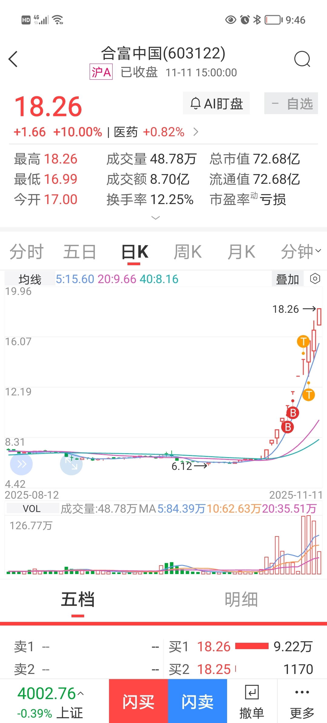 $合富中国(SH603122)$ 虽然第五个涨停进的,拿到现在,但因为太少,也懊悔不已!留个纪念吧!