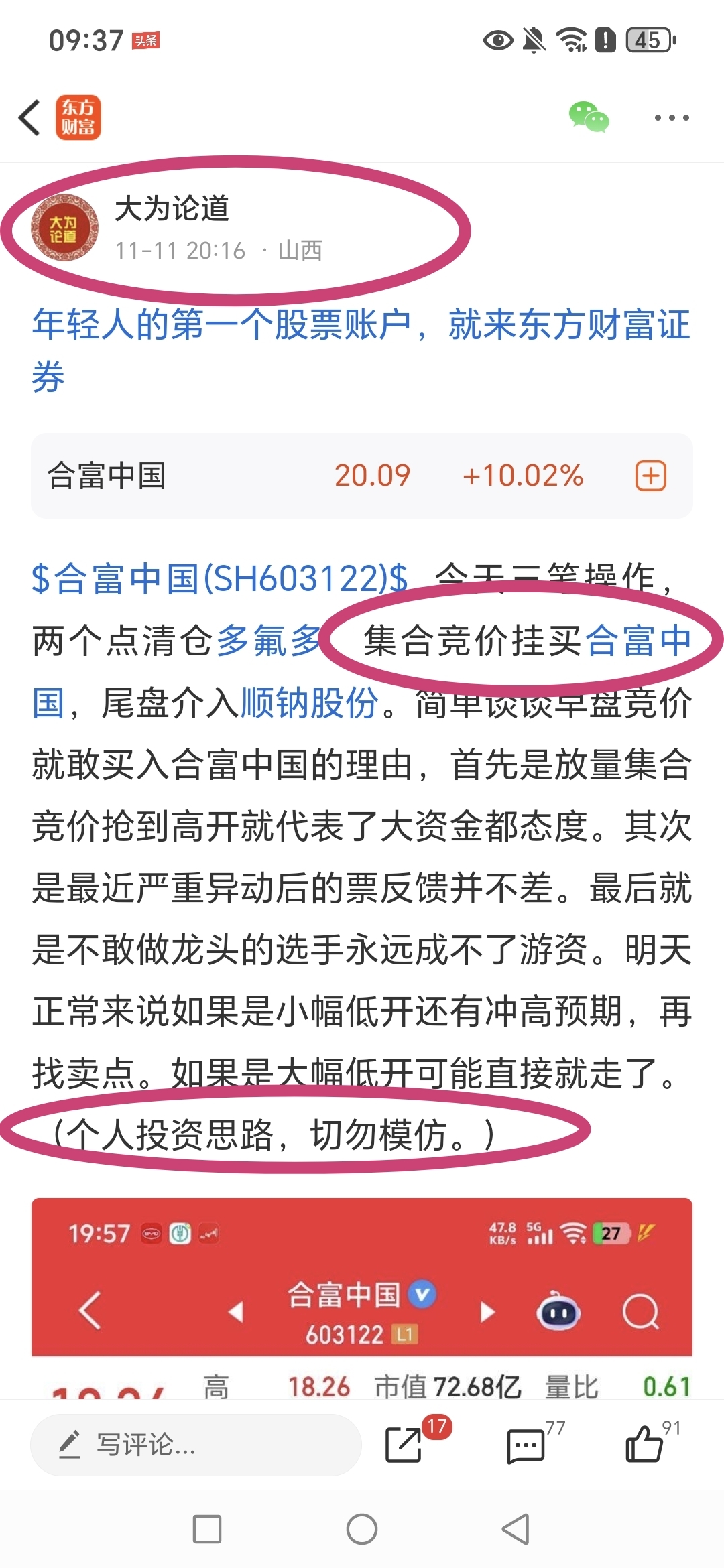$合富中国(SH603122)$ 谁赞成?谁反对?昨天说集合竞价介入合富中国受到一批韭菜的口诛笔伐!今天怎么样呢?其实很多时候发出来是想给予很多人启示,都是觉得风险很大了,从来没有人会想为什么那个点还敢买?而且我是收盘后才发的,后面写的很清楚了:个人投资观点,切勿模仿!