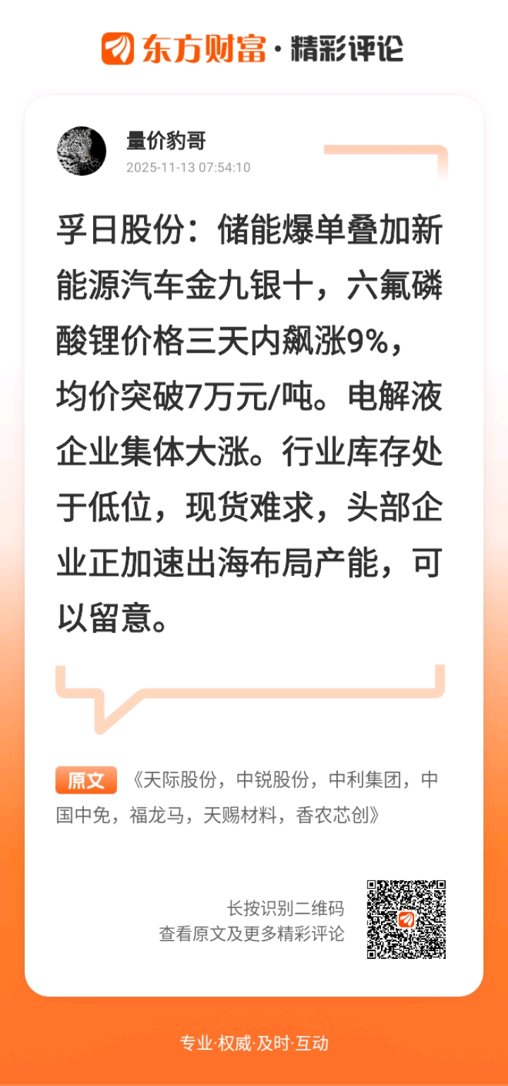 天际股份,锂电池赛道的黑马选手,昨天报价直接跳涨超 4 万元 1 吨,幅度超 50%,现在报价 10-12 万元1吨,这波涨价来得太突然!作为六氟磷酸锂产能 3.7 万吨 1 年的主儿,它家募投项目一期 1.5 万吨已经达产,二期厂房都建好了,就等添设备。而且 2025 年 Q3 六氟磷酸锂成本才 5-6 万元 1吨,现在价格涨起来,利润空间一下子就打开了。子公司还拿到了硫化锂材料的专利,这可是硫化物固态电池电解质的关键原材料,现在正在推进产业化,算是提前布局了下一代电池技术。加上还收购了磷化工企业,产品线覆盖双氟代磺酰亚胺锂、二氟磷酸锂这些电解液添加剂,业务面挺广,今天可以重点看看开盘后的承接力。