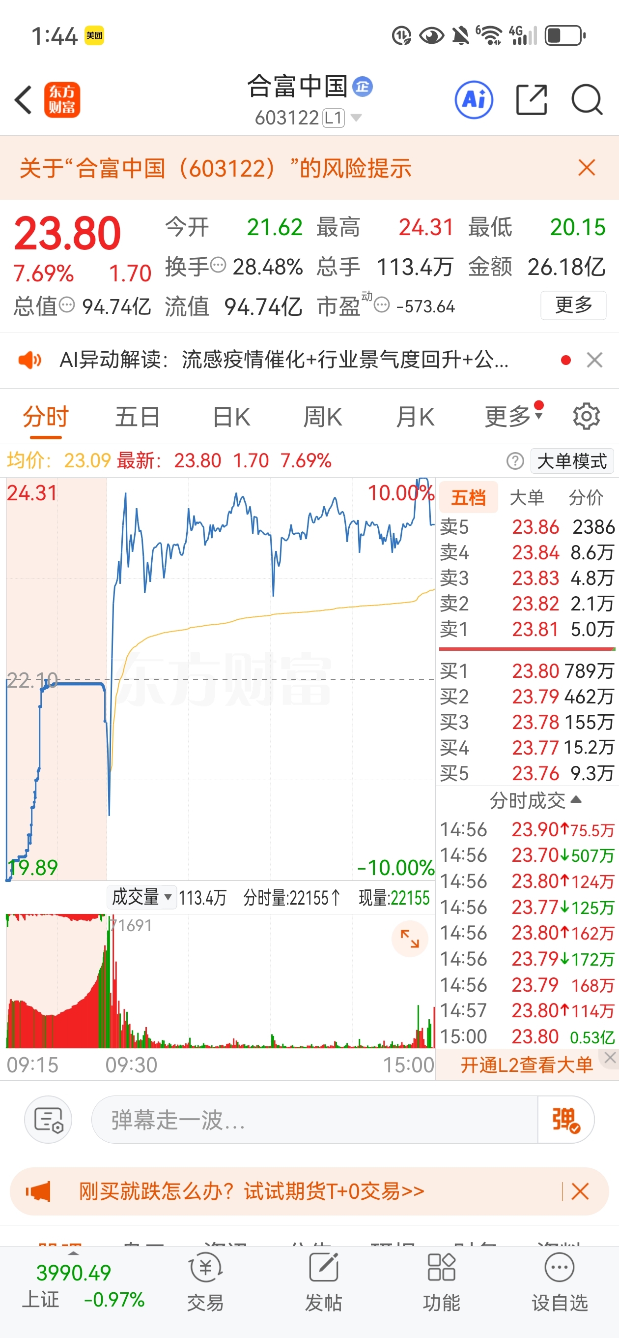$合富中国(SH603122)$ 以我多年的经验总结,我预测下个交易日这个股不会涨也不会跌。甚至不会波动。是不是很神奇
