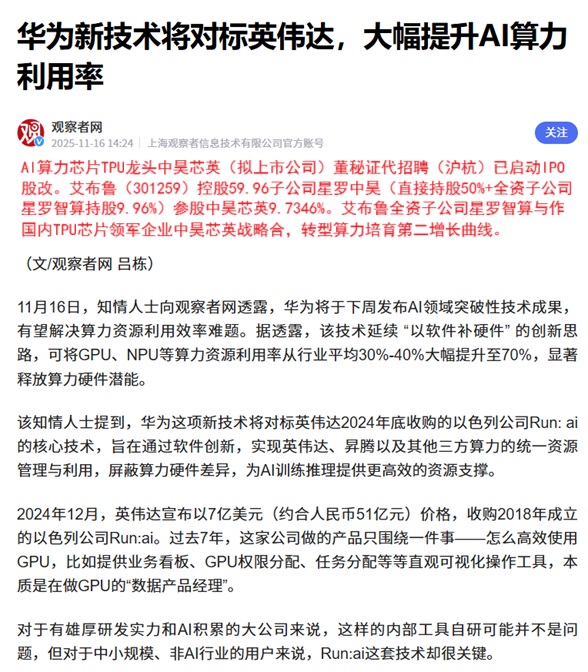 华为提升AI算力利用率对标英伟达!TPU独角兽中昊芯英IPO!股神重仓谷歌TPU