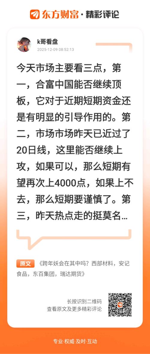 兄弟们!其实市场当前走得还是很简单的,而难点在于没有可持续性的热点上。短期这里再次放量,而且关键点已经来到了大盘多空平衡的位置。这里刚好也是30日线的位置。短期如果市场进一步放量突破,那么4000点依然有望看到,但是如果过不去,那么翻身就可能是新低。毕竟技术分析中有句话叫作,不新高就新低。所以现在就看今天30日线这里能否带量突破,而短期的这个走势也将直接决定12月的市场后半段的整体走势。短期。K哥还是对行情保持理性,毕竟目前关键点位没过,激动没啥用。方向上继续看CPO板块能否持续。