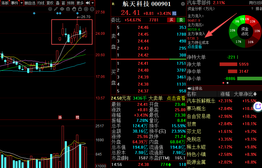 这主线是真的强,上周五板块里不少票都在走高,航天科技的表现也没让人失望。竞价低开后虽很快就被紫金拉回来,全天在高位震荡,没给太多低吸机会,主力做多的决心还是挺足,弱转强迹象还是很明显。近期商业航天的催化不断,不管是发射任务还是相关技术突破,都在给板块添柴,而且板块梯队很完整,有龙头带队,补涨标的也在不断冒出来。航天科技作为军工+商业航天的双重概念股,辨识度自然不低,上周五的走势也刚好契合板块的强势氛围。技术面看,已经弱转强了,而且量能配合得不错。开的不高就看看位置尽量低点,低开就直接点;核心看量能能不能持续。只要主线热度不褪,这波弱转强延续性还是值得期待的!