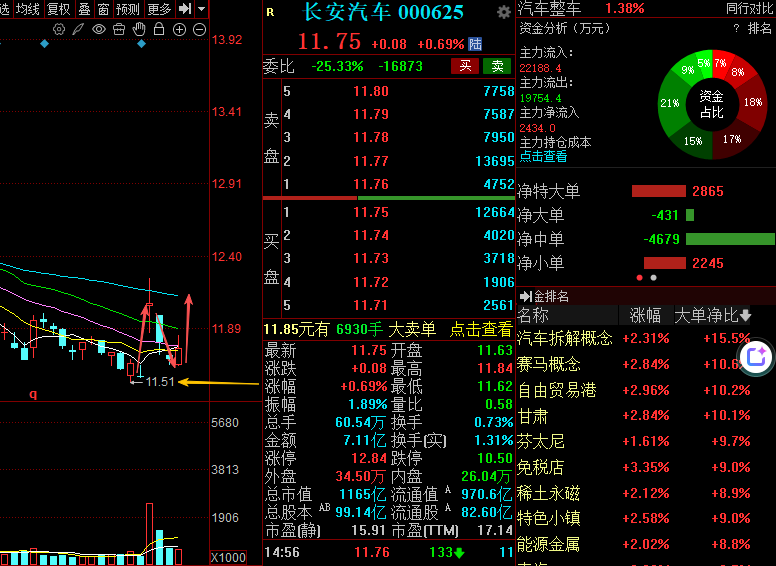 前期连续调整,探底11.5后接力意愿挺足,每次回调都有紫晶托底,没什么深跌空间!刚好赶上自动驾驶成了汽车板块的核心热点,16号直接跳空高开冲高,成交额放大后脉冲上行,盘面异动信号很突出。经历两天温和调整消化筹码,上周五妥妥走出弱转强行情,企稳迹象特别清晰!更关键的是周末传来利好——长安拿下首块自动驾驶专用正式号牌,热度直接往上冲。现在筹码洗得够充分,还有弱转强打底+热点加持,今天应该收大阳线了,低开应该不可能了,平开或者高举高打都可以。就看给不给机会了。