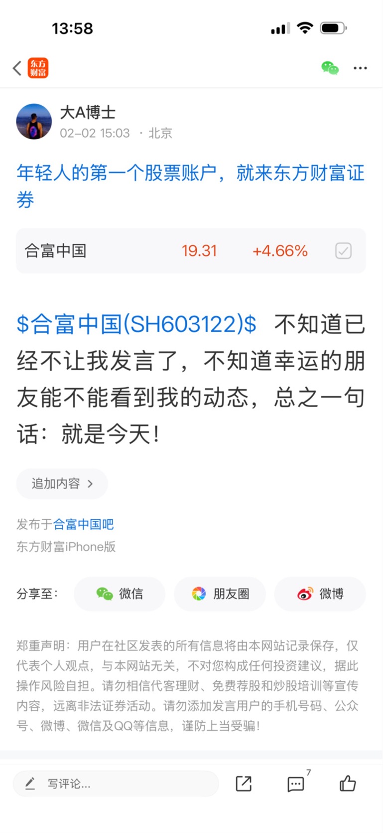 温馨提示: 1.根据《证券法》规定,禁止编造、传播虚假信息或者误导性信息,扰乱证券市场;2.用户在本社区发表的所有资料、言论等仅代表个人观点,与本网站立场无关,不对您构成任何投资建议。用户应基于自己的独立判断,自行决定证券投资并承担相应风险。《东方财富社区管理规定》