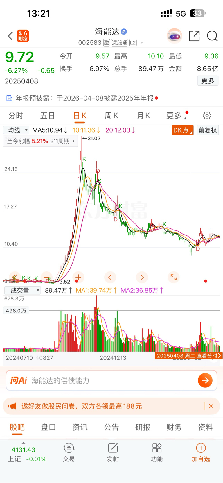 可以看看海能达,短期从6涨到31,然后一下从31跌到9,几乎没有什么反弹$海能达(SZ002583)$
