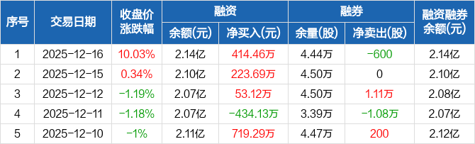 翠微股份融资融券信息显示,2025年12月16日融资净买入414.46万元;融资余额2.14亿元,较前一日增加1.98%。