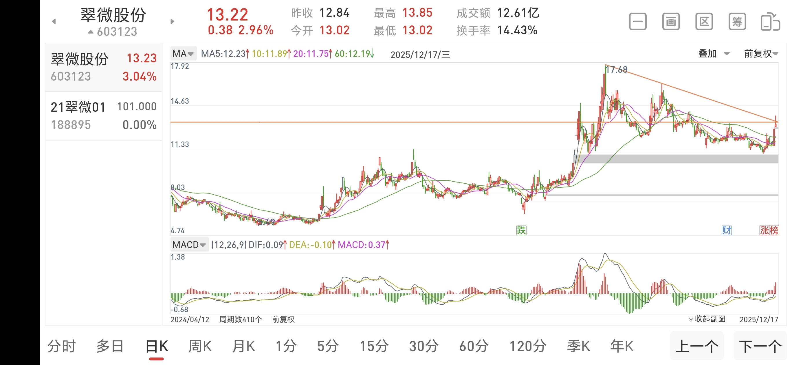 $翠微股份(SH603123)$ 13.4压力大,冲过去就美