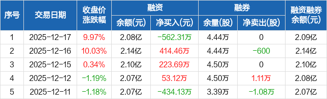 融资方面,当日融资买入1.16亿元,融资偿还1.22亿元,融资净偿还562.31万元。融券方面,融券卖出0股,融券偿还0股,融券余量4.44万股,融券余额62.69万元。融资融券余额合计2.09亿元。