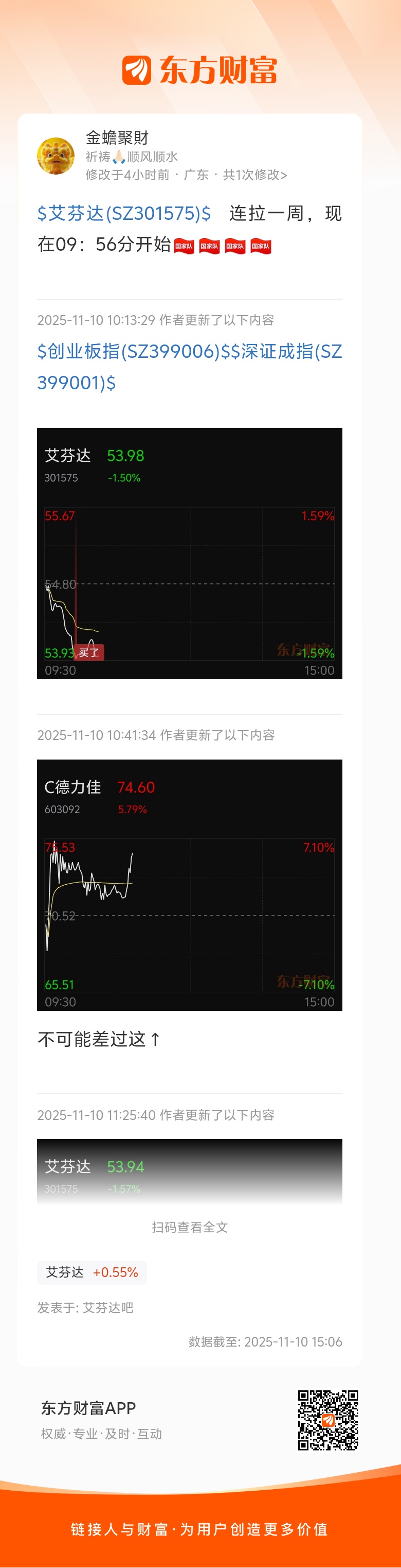 $艾芬达(SZ301575)$   连拉一周,现在09:56分开始