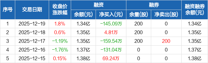 融资方面,当日融资买入310.48万元,融资偿还455.57万元,融资净偿还145.09万元。融券方面,融券卖出0股,融券偿还0股,融券余量200股,融券余额1356元。融资融券余额合计1.34亿元。
