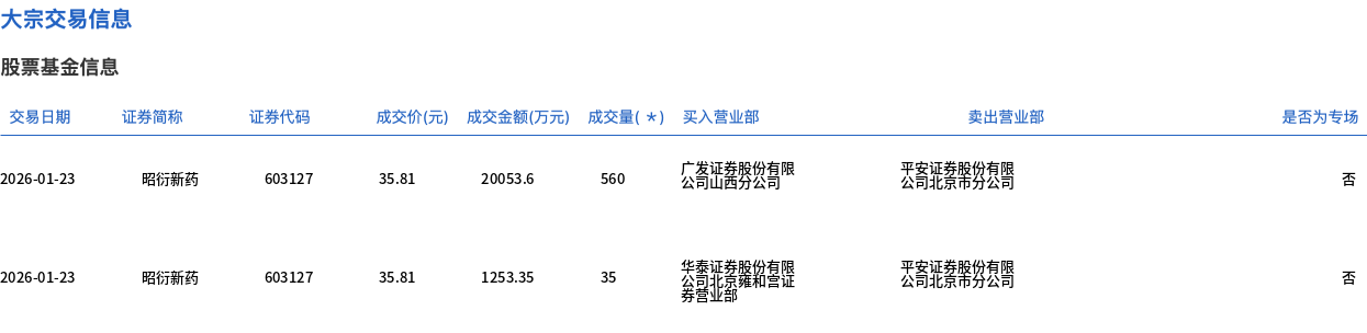1月23日,昭衍新药大宗交易成交595万股,成交额2.13亿元,占当日总成交额的19.74%,成交价35.81元,较市场收盘价41.07元折价12.81%。