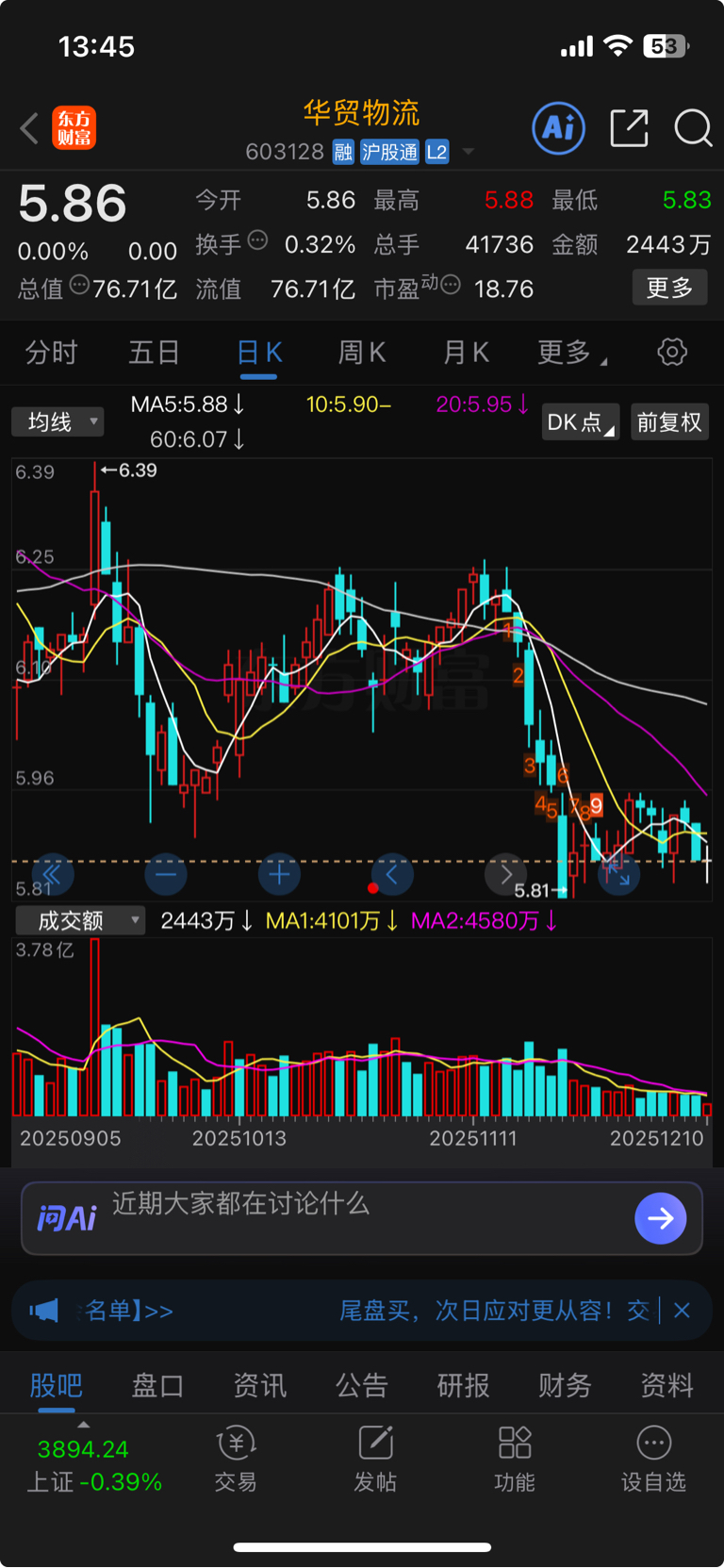 $华贸物流(SH603128)$ 你们能不能给点力?该不会今天收平盘十字星吧?
