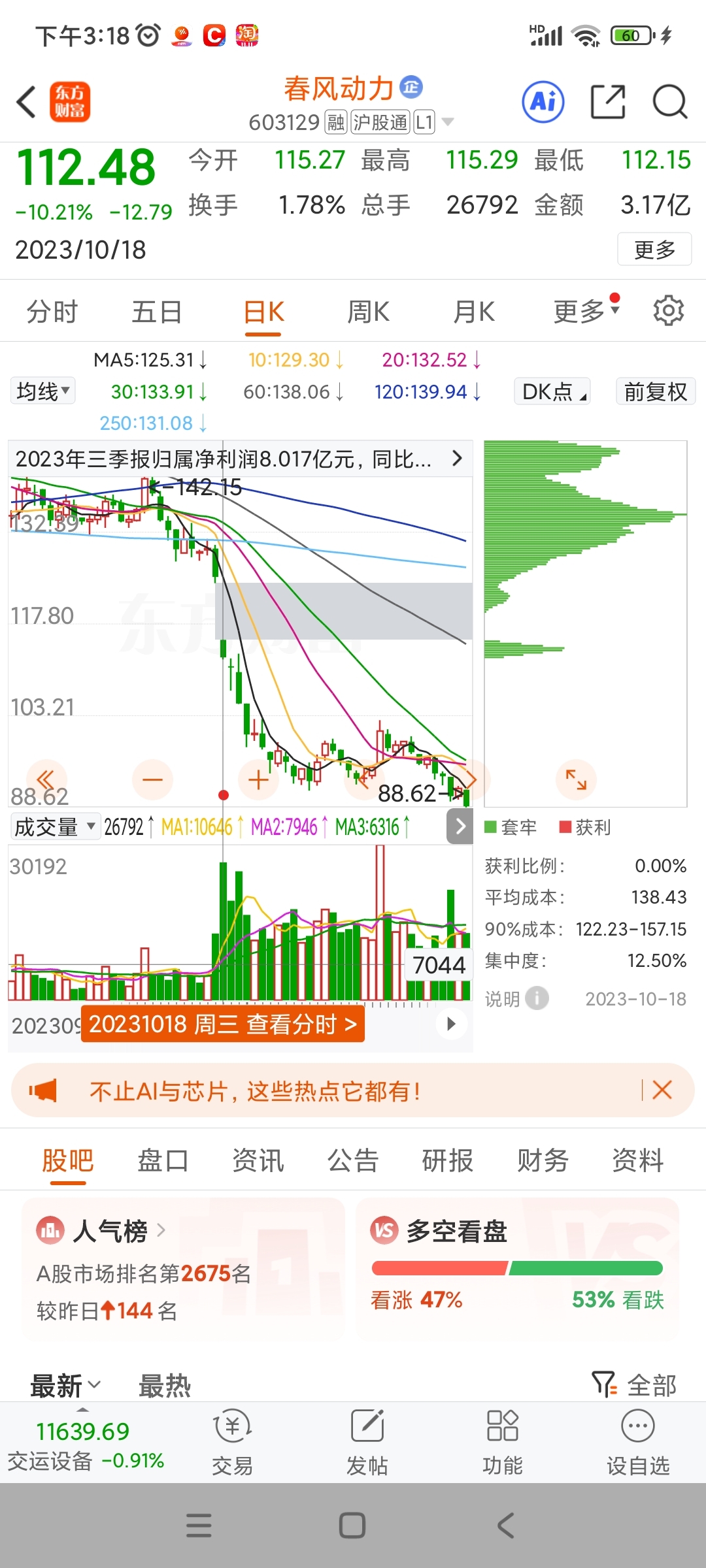 $春风动力(SH603129)$ 23年的三季报一出一字跌停