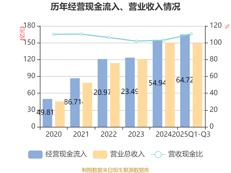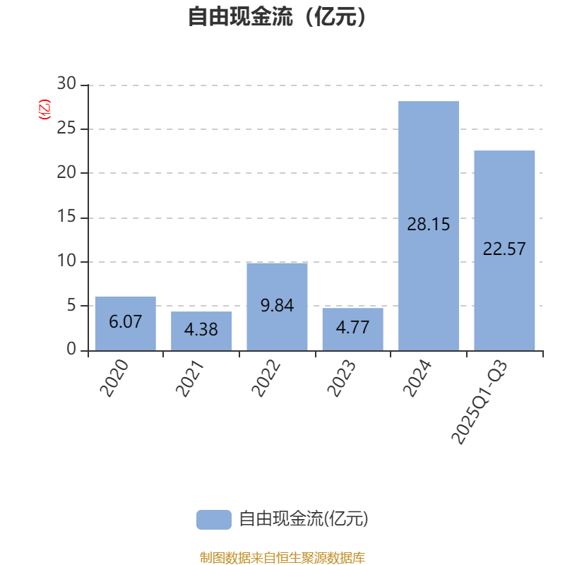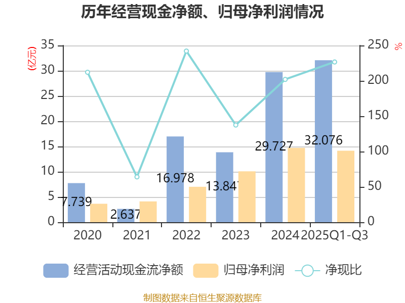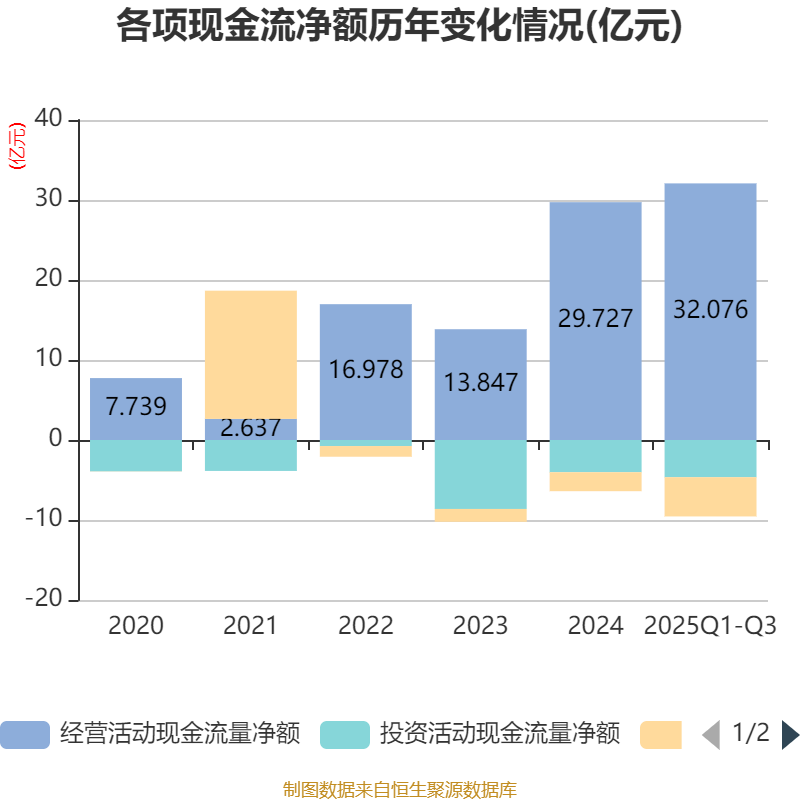 2025年前三季度,公司经营活动现金流净额为32.08亿元,同比增长42.8%;筹资活动现金流净额-4.91亿元,同比减少2.65亿元;投资活动现金流净额-4.65亿元,上年同期为-2.91亿元。