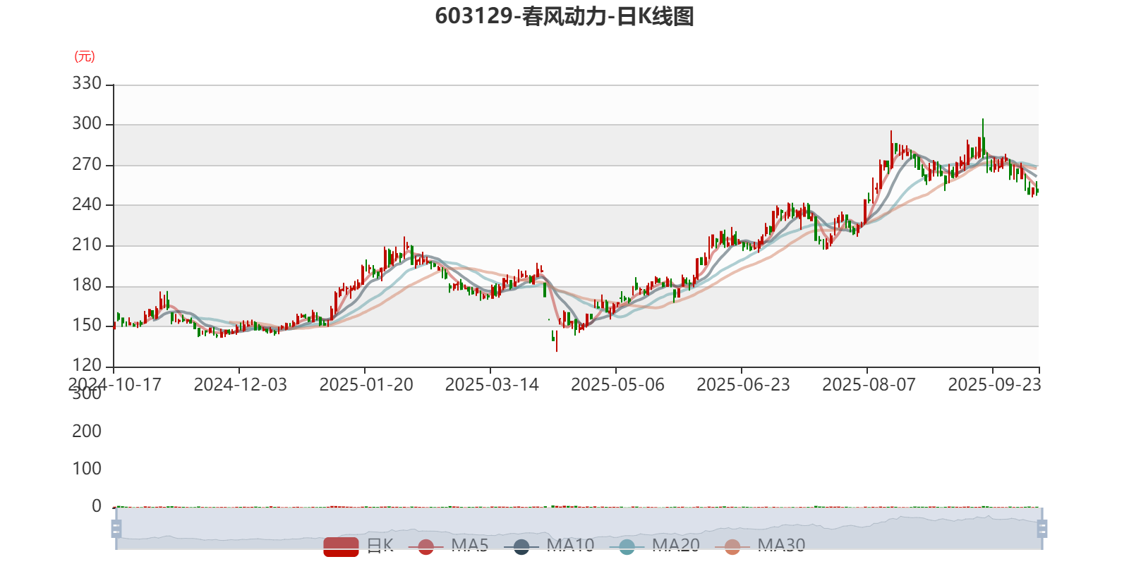 中证智能财讯春风动力(603129)10月17日披露2025年第三季度报告。前三季度公司实现营业总收入148.96亿元,同比增长30.10%;归母净利润14.15亿元,同比增长30.89%;扣非净利润13.5亿元,同比增长 28.61%;经营活动产生的现金流量净额为32.08亿元,同比增长42.80%;报告期内,春风动力基本每股收益为9.29元。