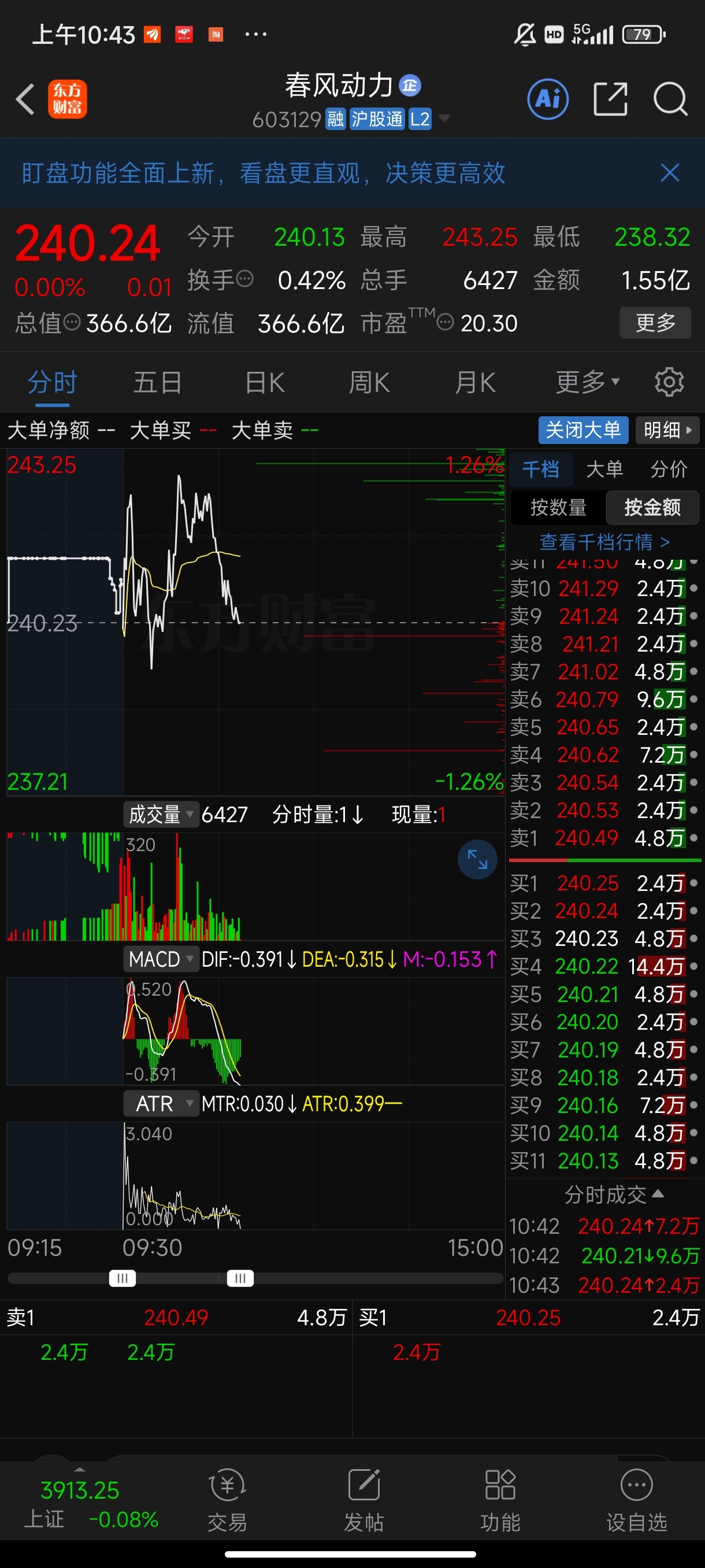 $春风动力(SH603129)$ 这操盘非常厉害,240.240,刚好0%,厉害,对仗