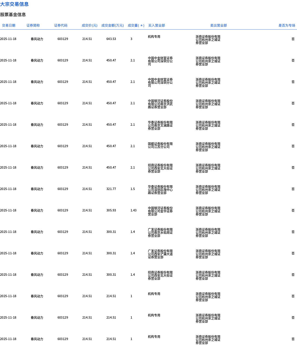 春风动力今日大宗交易折价成交25.73万股,成交额5518.51万元