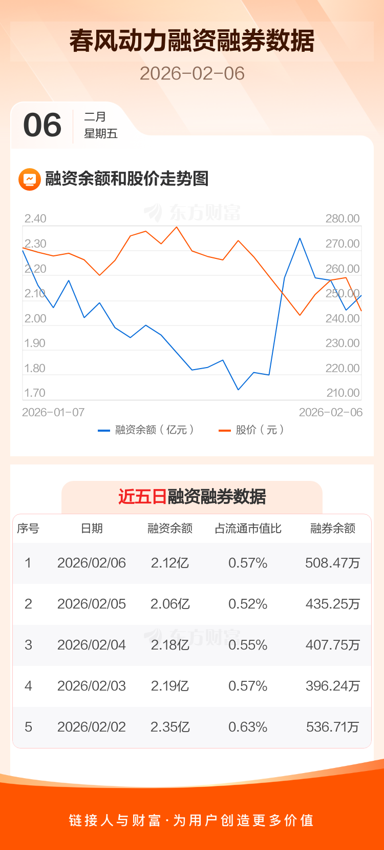 交易所最新数据显示,春风动力于2026年2月6日获融资买入3536.58万元,融资偿还2945.26万元,当日融资净买入591.32万元。目前,该股融资余额2.12亿,占流通市值比例为0.57%。