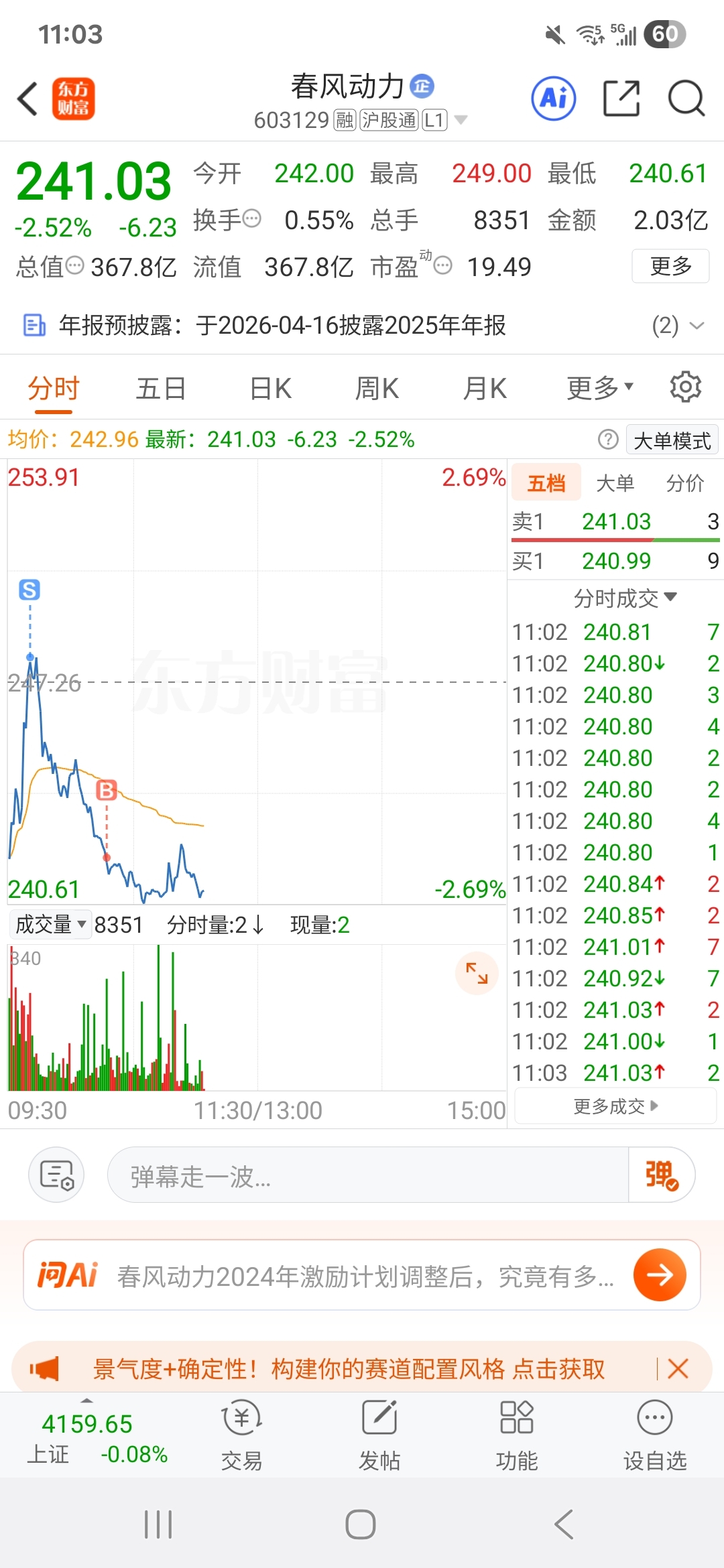 $春风动力(SH603129)$ 一手操作,248卖了,242又买回来,下手还是太早,我就想赚个饭钱