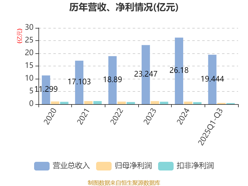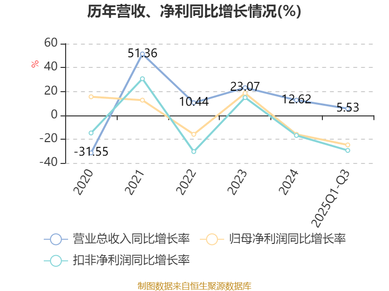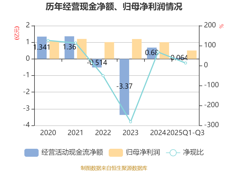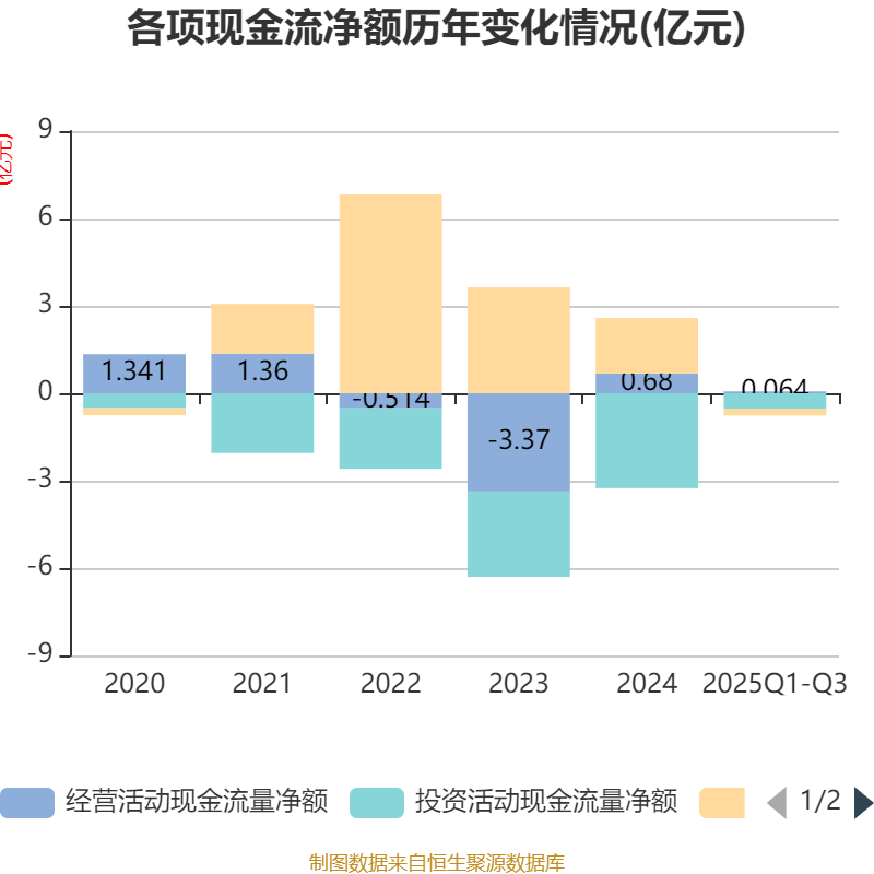 2025年前三季度,公司经营活动现金流净额为644.89万元,同比增加1.59亿元;筹资活动现金流净额-2325.11万元,同比减少2.04亿元;投资活动现金流净额-5289.88万元,上年同期为-1.62亿元。