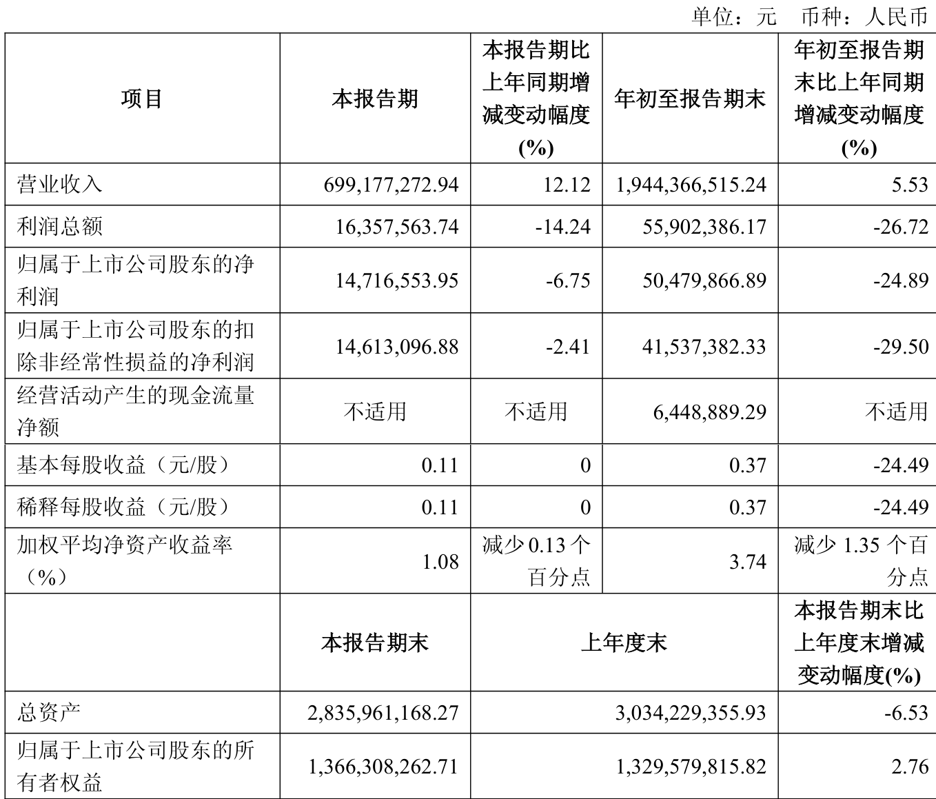 中证智能财讯云中马(603130)10月28日披露2025年第三季度报告。前三季度公司实现营业总收入19.44亿元,同比增长5.53%;归母净利润5047.99万元,同比下降24.89%;扣非净利润4153.74万元,同比下降29.50%;经营活动产生的现金流量净额为644.89万元,上年同期为-1.52亿元;报告期内,云中马基本每股收益为0.37元,加权平均净资产收益率为3.74%。