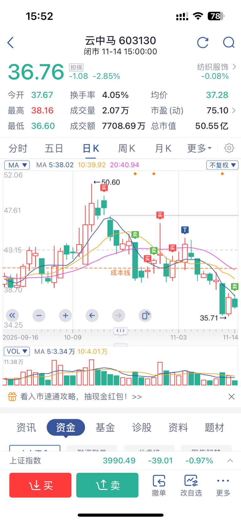 $云中马(SH603130)$ 整体48块多的本。亏麻了。彻底割完了。好好过周末