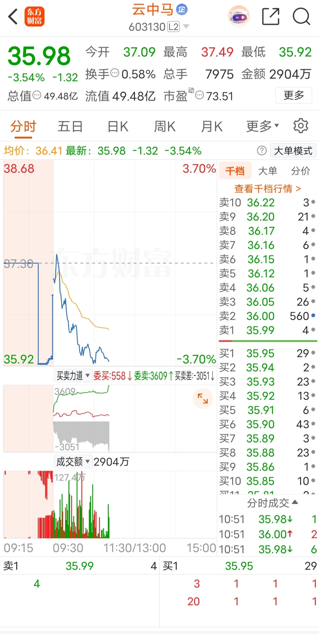 $云中马(SH603130)$ 一个压单能直接砸跌停