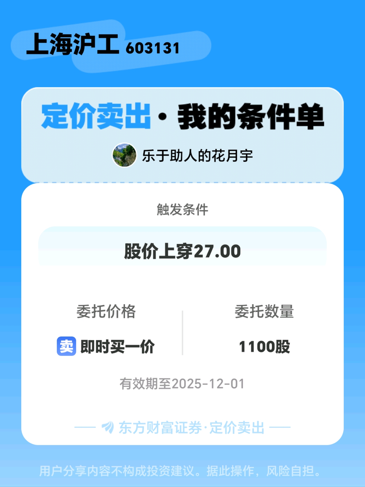 #条件单交流# #定价卖出晒单# 一位股神设置了一个定价卖出条件单,接下来就是见证奇迹的时刻~$上海沪工(SH603131)$