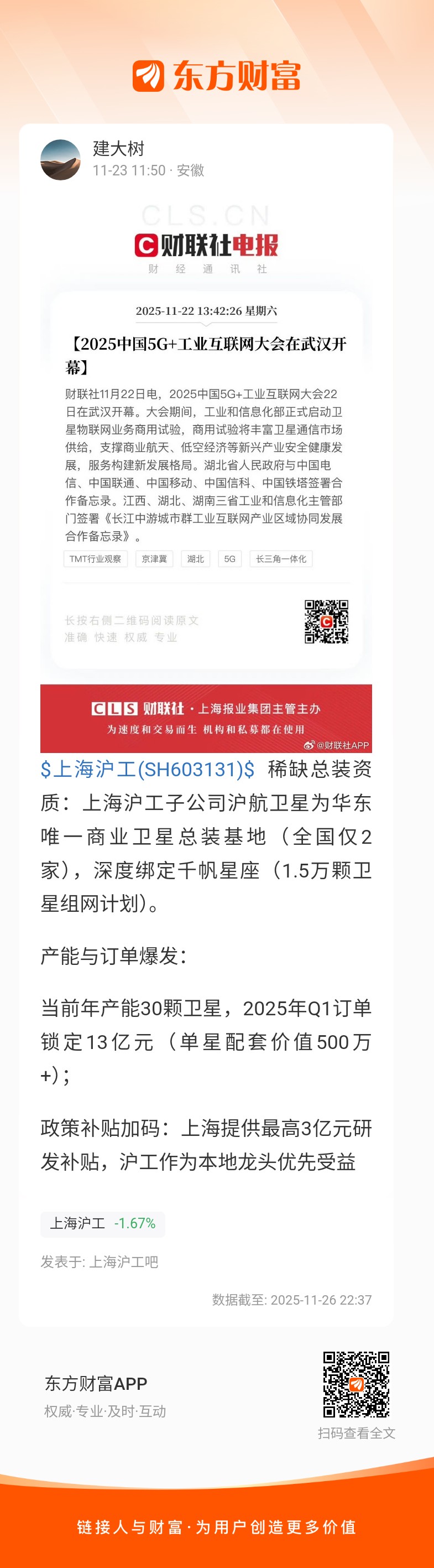 $上海沪工(SH603131)$ 稀缺总装资质:上海沪工子公司沪航卫星为华东唯一商业卫星总装基地(全国仅2家),深度绑定千帆星座(1.5万颗卫星组网计划)。
