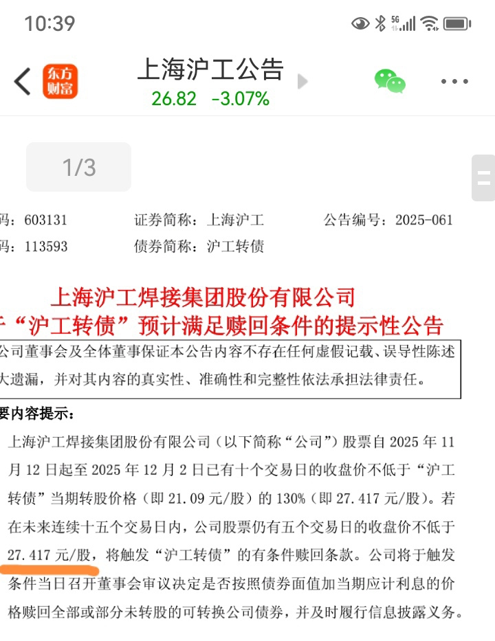 $上海沪工(SH603131)$ 5天内低于27.4就不强赎啦