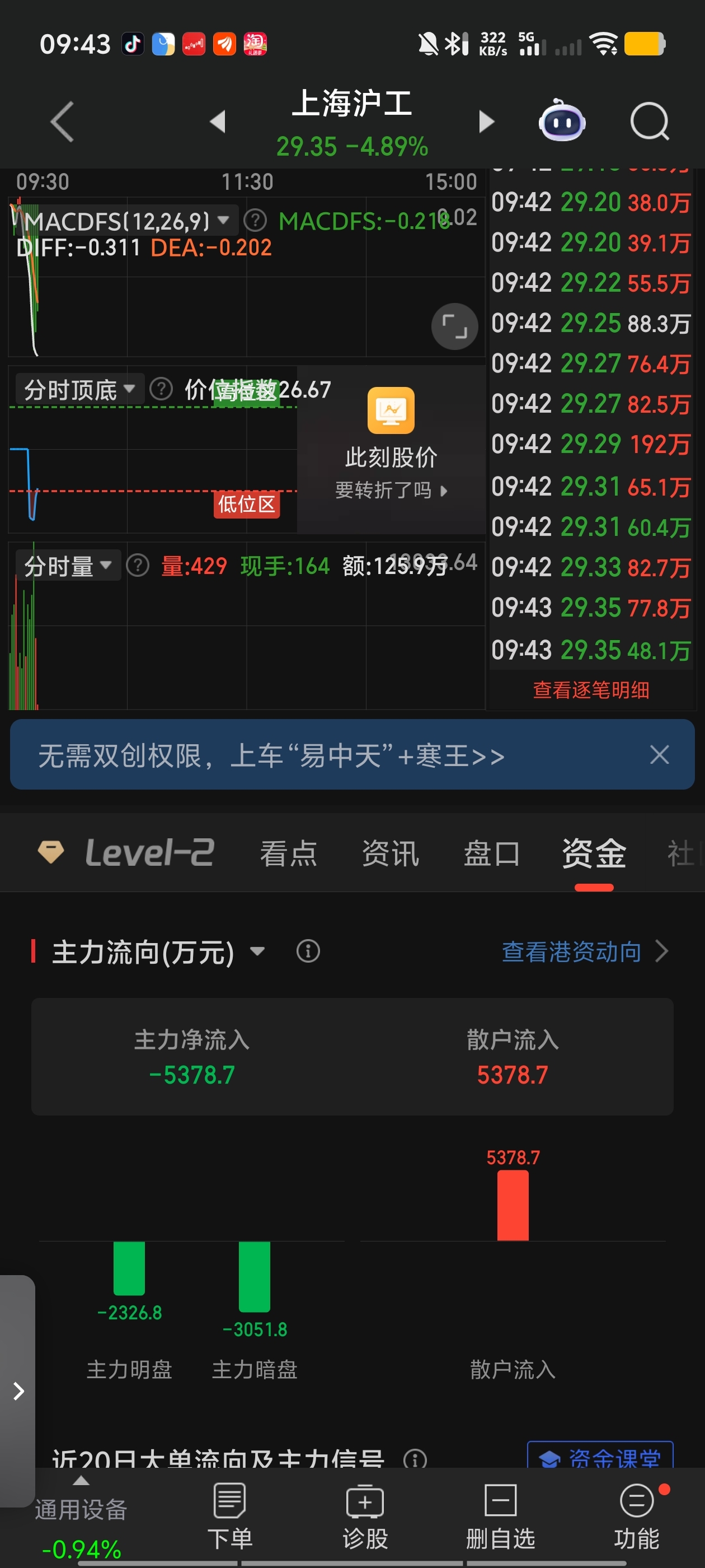 $上海沪工(SH603131)$ 目前主力在流出,我会找机会随时回来!周四全仓去$航天电子(SH600879)$ $中超控股(SZ002471)$ 是对的!